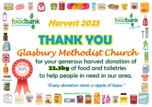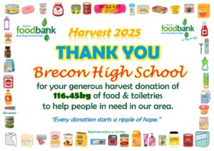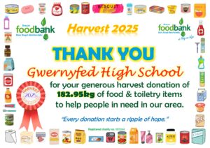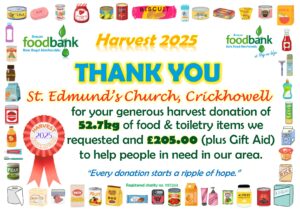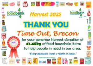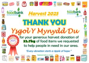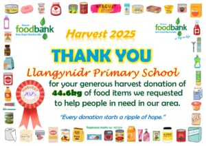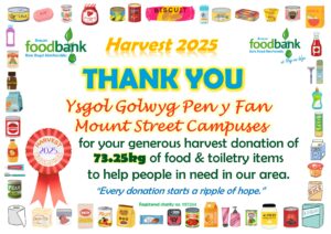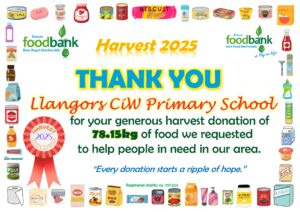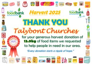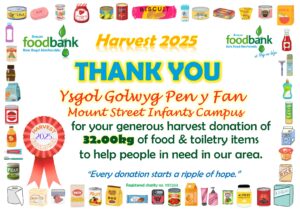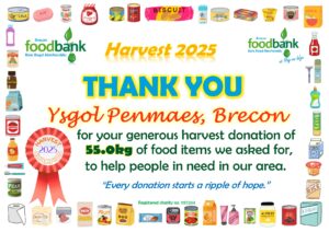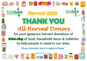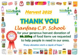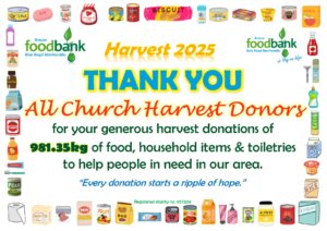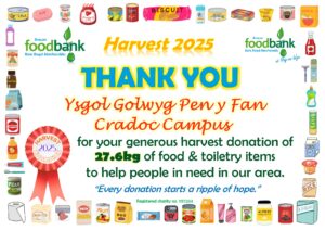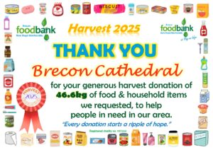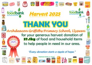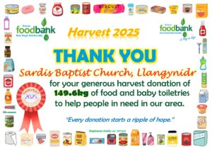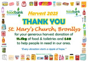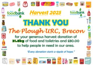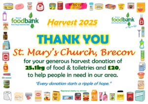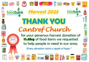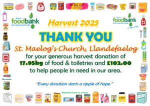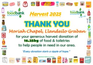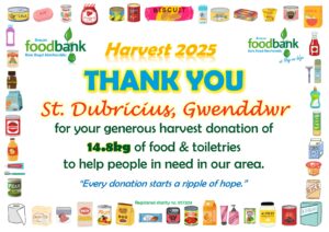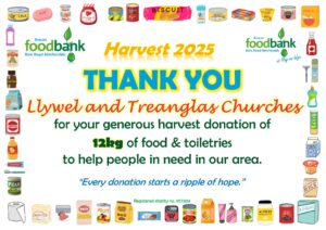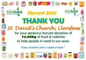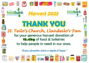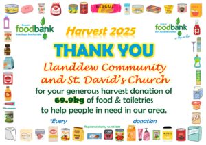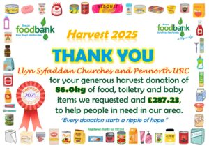 This all gave the grand total of 2134.1kg of food, toiletries and household items (washing detergent, toilet rolls etc.)! A marvellous total, thank you so much to all who donated! It is about 230kg more than was donated during harvest in 2024, which is particularly pleasing when out ‘normal’ donations are falling due to the rise in the cost of living. Diolch yn fawr iawn.
