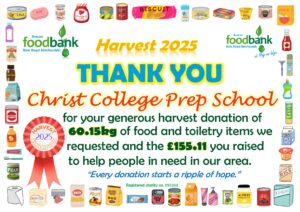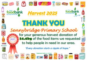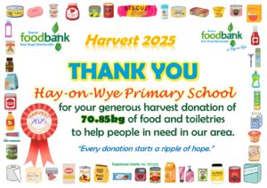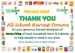 We then send certificates of appreciation for the donations, letting them know the weight that they collected. Please don’t compare the weights though, as different Harvest Champions collected things that weighed different amounts – packets of instant mash weigh a lot less than jars of pasta sauce!  And of course, some schools and churches are smaller than others. We are tremendously grateful for EVERY donation because they ALL help us to help those in need in our area!